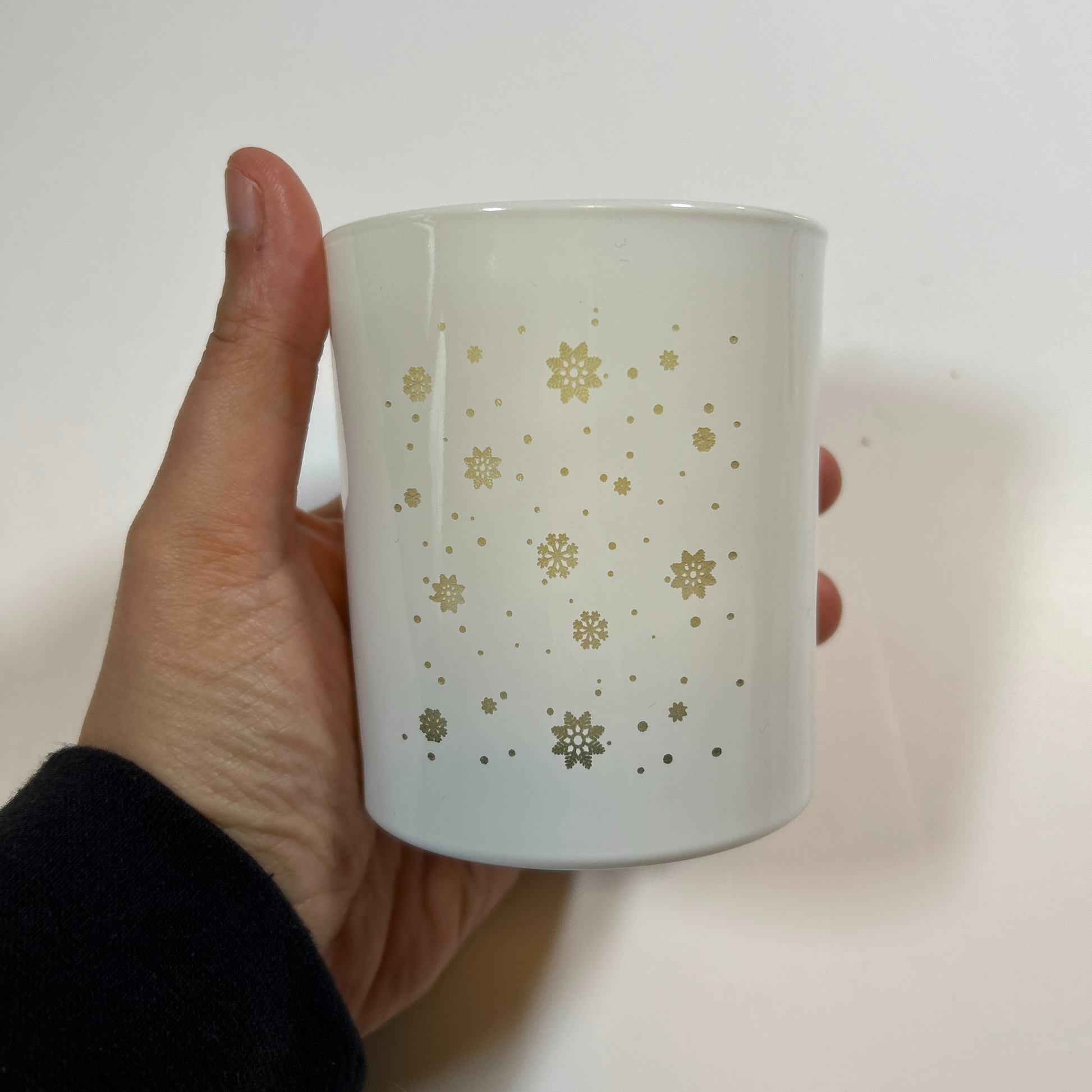 This candle comes in a 30cl gloss white glass jar, beautifully crafted with intricate laser-etched snowflakes on the front. As it burns, the warm glow shines through the delicate design, creating a cozy and magical holiday ambiance.
